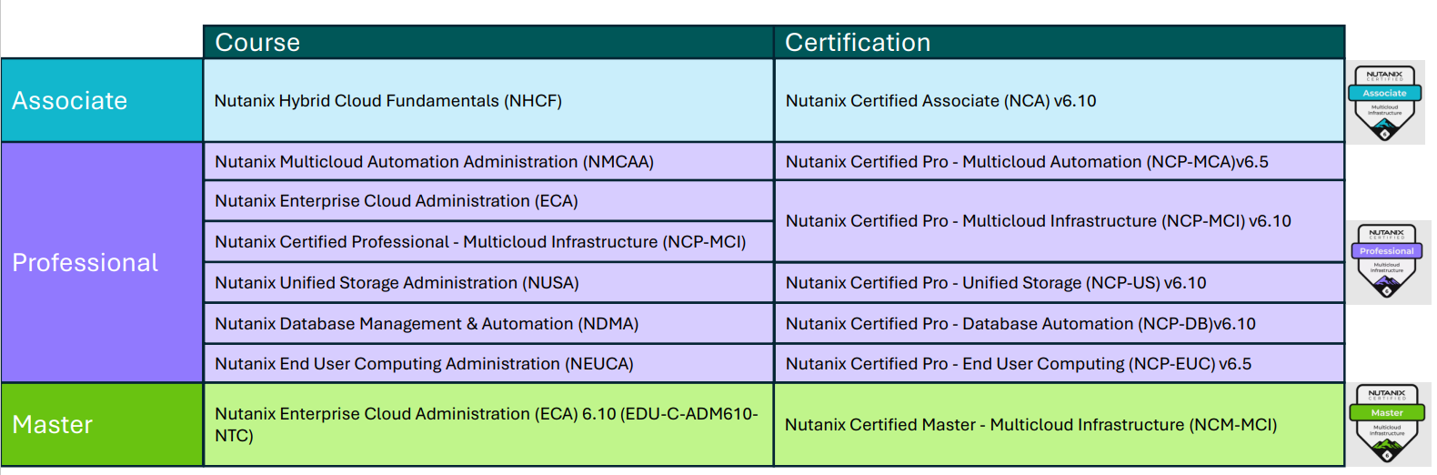 - Percorso di certificazione completo: Nutanix offre un programma di certificazione multilivello che fornisce un percorso chiaro di apprendimento e sviluppo man mano che cresce la tua esperienza.